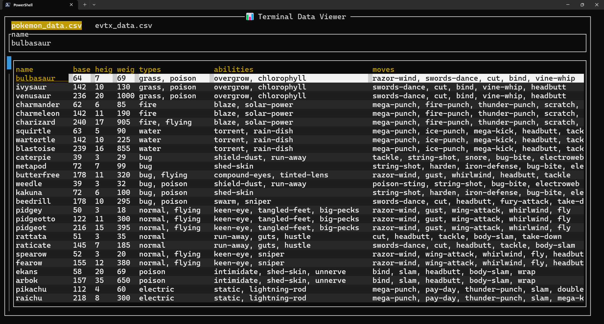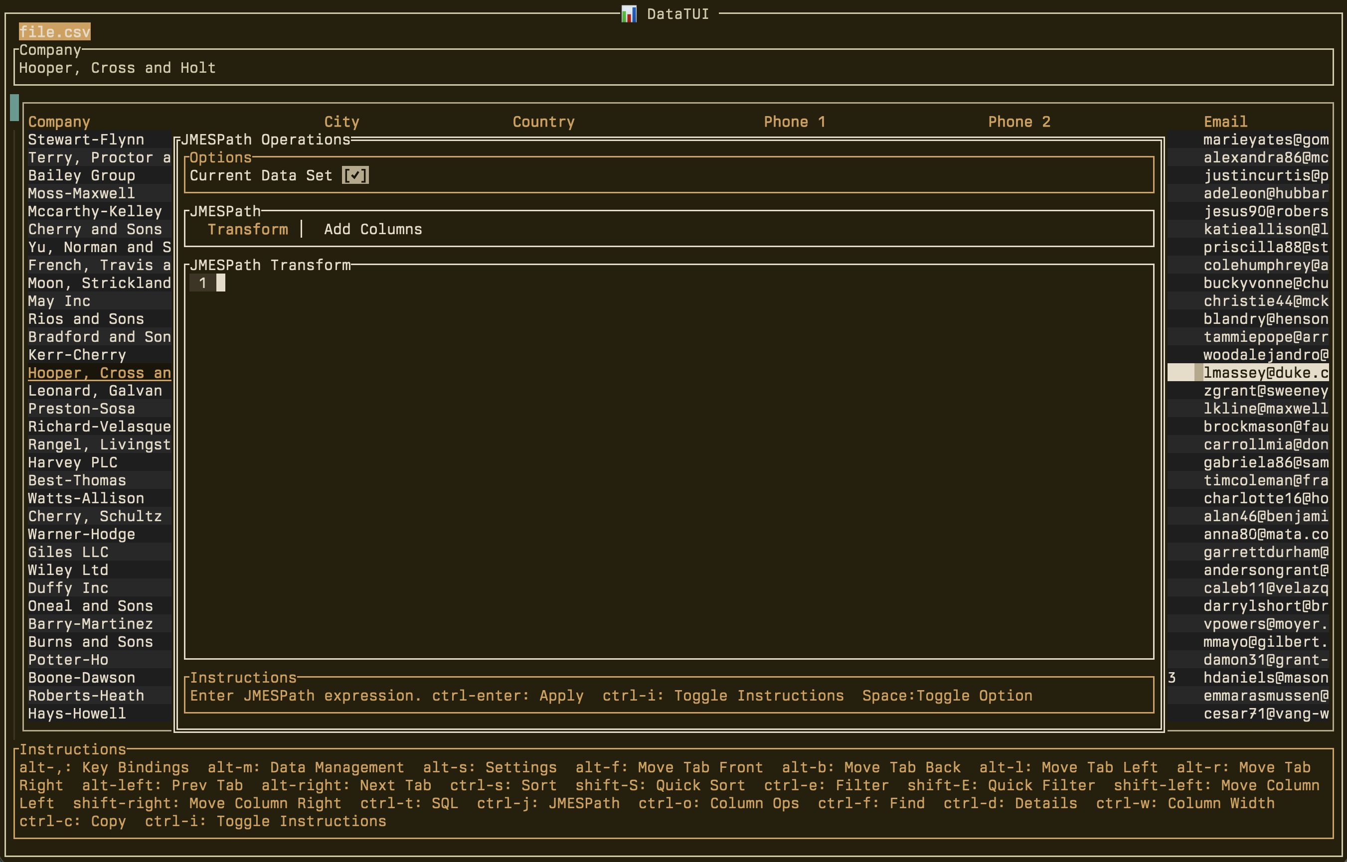 datatui has some advanced features (note: synthetic data).datatui --load 'csv:file.csv'
